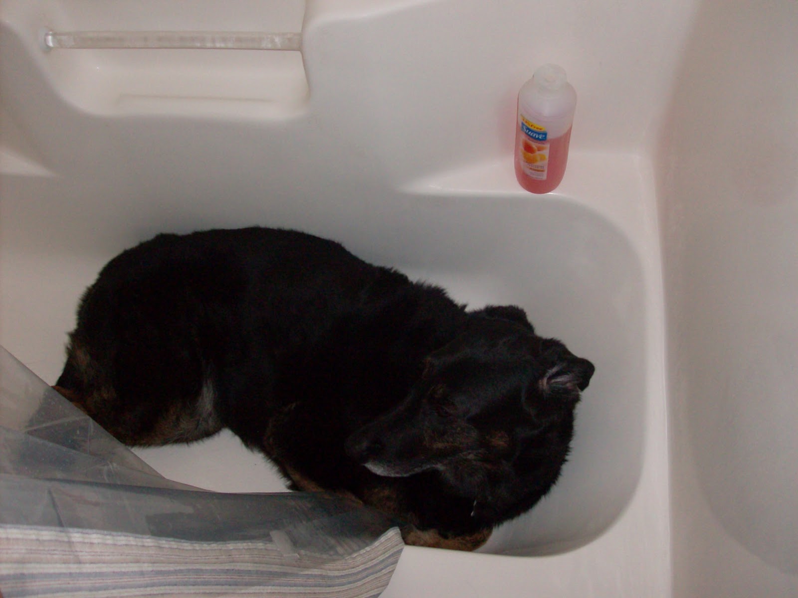 These dogs really do render me speechless from time to time. Today I was in the kitchen and I could hear Pellet snooping around in the guest bathroom. What did I find when went looking for him? This:
